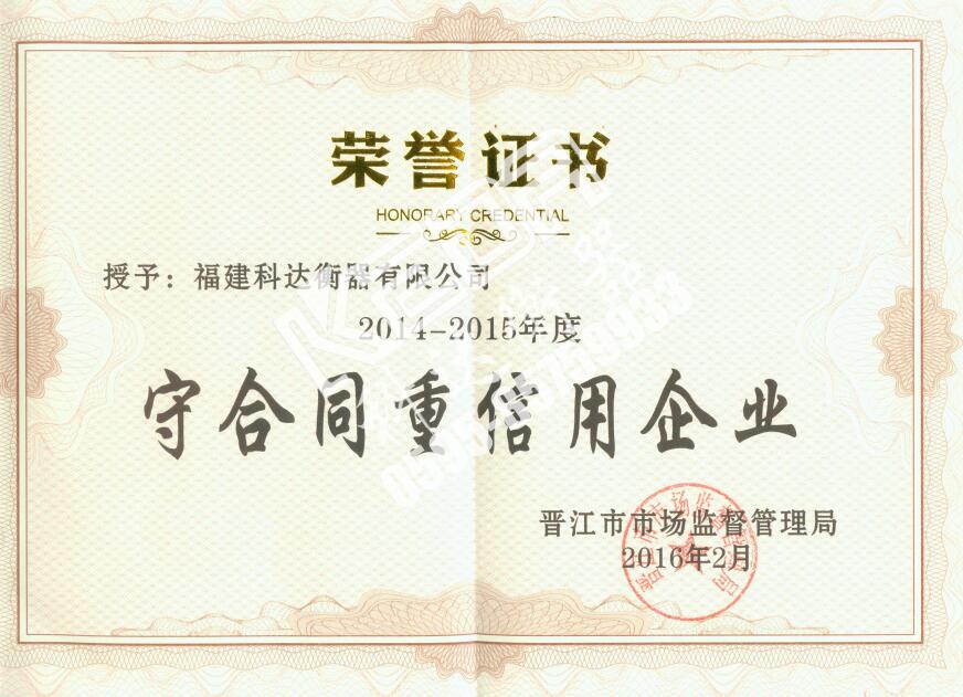 福建科達(dá)衡器有限公司榮獲2014-2015年度“守合同重信用企業(yè)”榮譽(yù)稱(chēng)號(hào)
