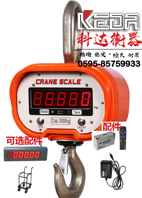 福建科達衡器有限公司所設計生產(chǎn)的寧德吊鉤秤按照數(shù)值顯示的形式可以分為無線數(shù)傳型電子吊鉤秤(1-50噸)和直視型電子吊鉤秤;其中直視型電子吊鉤秤又可以分為高溫耐熱型電子吊鉤秤(1-30噸),防爆電子吊鉤秤(1-50噸)、高精度電子吊鉤秤(1-50噸)、便攜式電子吊鉤秤(0.1t~1t)、掌上型電子吊鉤秤(手掌稱 30kg~300kg)等;按照量程來分又可以分為:1噸吊鉤秤、2噸吊鉤秤、3噸吊鉤秤、5噸吊鉤秤、10噸吊鉤秤、15噸吊鉤秤、20噸吊鉤秤、30噸吊鉤秤、40噸電子吊鉤秤、50噸電子吊鉤秤。福建科達衡器所生產(chǎn)的寧德電子吊鉤秤均配有電子吊鉤稱專用電池和專用充電器,均可選配無線大屏幕和小推車。